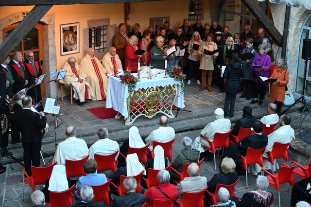 Die feierliche Dankmesse fand im Innenhof des Pflegeheims St. Anna statt, die von einem gemischten Chor unter Leitung von Ingrid Rieder sowie einem Bläserquintett der Bürgerkapelle Lana musikalisch mitgestaltet wurden. Die Dankbarkeit gegenüber dem Herrgott und den Menschen, die ihn in diesen Jahren unterstützten, standen im Mittelpunkt der Predigt des Jubilars: Er könne auf viele Stationen zurückblicken, an denen er in den vielen zurückliegenden Jahren Erfahrungen sammeln und wirken durfte. Er blickte zurück auf die Jahre des Studiums in Trient, wo damals auch die Theologen des deutschsprachigen Anteils der Erzdiözese Trient studierten und eine solide und selbstbewusste eigene Gruppe bildeten. Es sei damals einfach eine große Begeisterung für den Glauben und das Priestertum spürbar gewesen. Nach dem Studium und den heiligen Weihen durfte er unter anderem in der Deutschordenspfarrei Sarnthein, in Schlanders am Gamperheim, in der Pfarre Schottenfeld (Wien) und in der Erzpfarre Maria Himmelfahrt in Lana wirken. Gute drei Jahrzehnte hat er als Prior der Südtiroler Deutschordensprovinz und als Dekan von Lana und Pfarrer der Erzpfarre Maria Himmelfahrt in Lana gedient und konnte hier seine Spuren hinterlassen. P. Peter, so betonte er in seiner Predigt, hat immer wieder versucht, sich Gott zur Verfügung zu stellen, so wie er ist, auch im Bewusstsein eigener Schwächen.