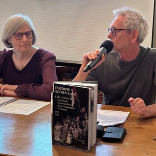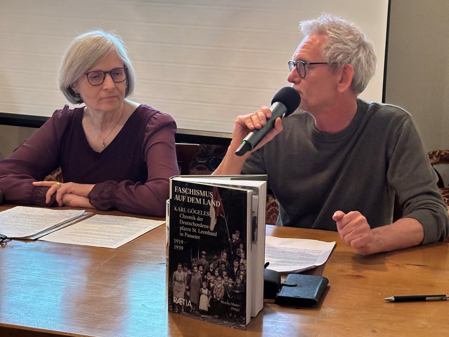 Die Lesung der Chronikpassagen übernahm kurzfristig Siegfried Giuliani, der für den verhinderten Patrick Rina eingesprungen war, und ließ Gögeles Erzählungen mit seiner kraftvollen Stimme lebendig werden. Parallel dazu erläuterte Thomas Kager im Frage-Antwort-Gespräch mit Autorin und Herausgeberin Monika Mader den geschichtlichen Hintergrund jener einschneidenden Zeit. Dabei wurde deutlich, wie Karl Gögele die Einschränkungen durch die Militärpräsenz nach dem Ersten Weltkrieg, den zunehmenden Druck der Italianisierung und schließlich das Aufkommen des Nationalsozialismus in der Berggemeinde St. Leonhard erlebte. Seine rund 20-jährigen Aufzeichnungen zeichnen ein realistisches Bild des Alltags und der Lebensumstände der ländlichen Bevölkerung, dokumentieren die subtilen Widerstände gegen die politische Vereinnahmung und bilden ein einzigartiges Zeitzeugnis über die Manifestation von Diktatur im Passeiertal – und darüber hinaus.